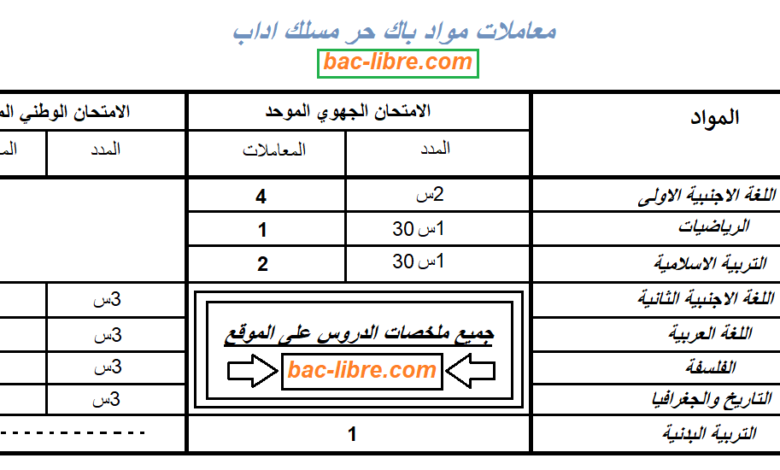معاملات مواد الامتحان الوطني الموحد باك حر اداب