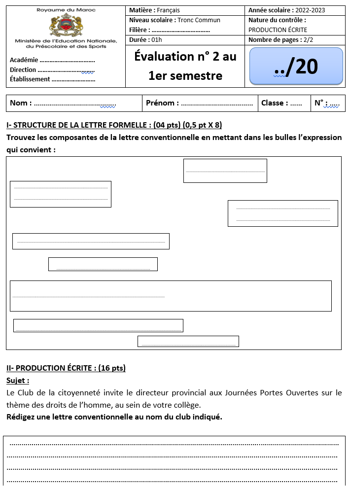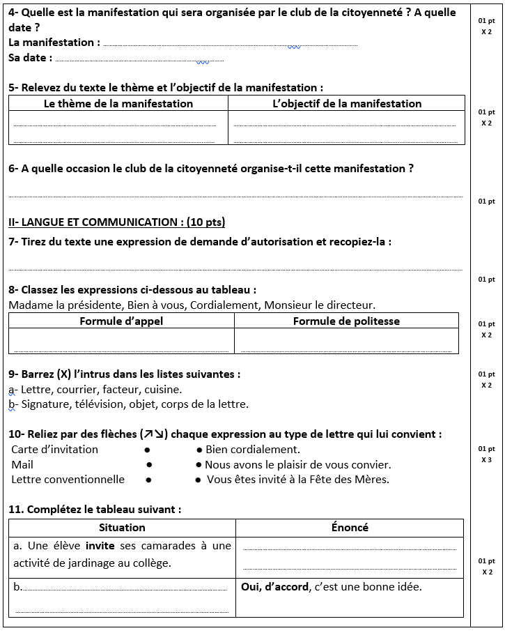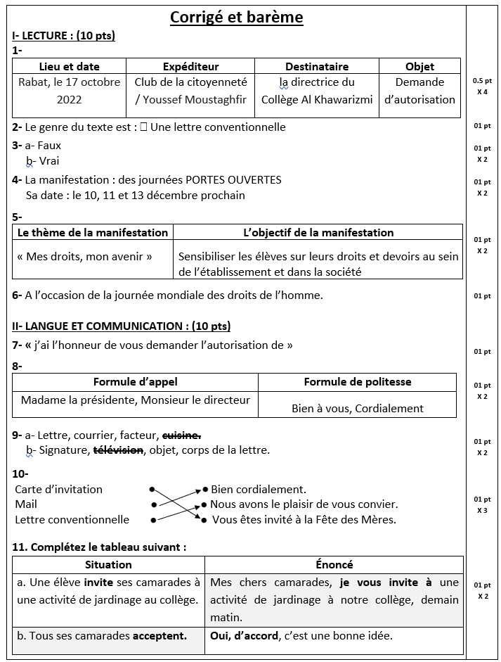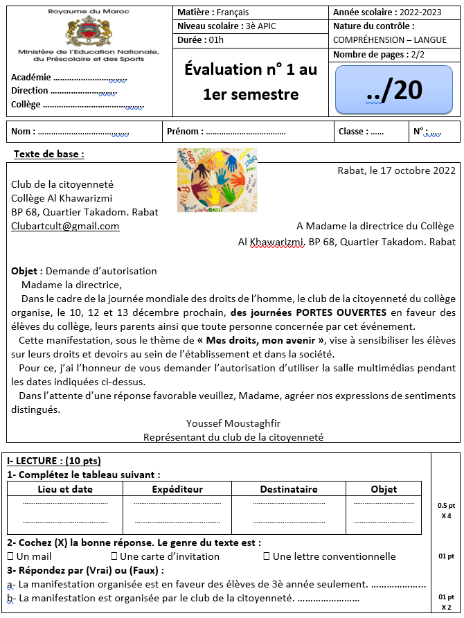 Évaluation n° 1 et 2 au 1er semestre – 3ème année collégiale – Compréhension + Langue / Expression écrite + Correction PDF – contrôle Manuel Parcours