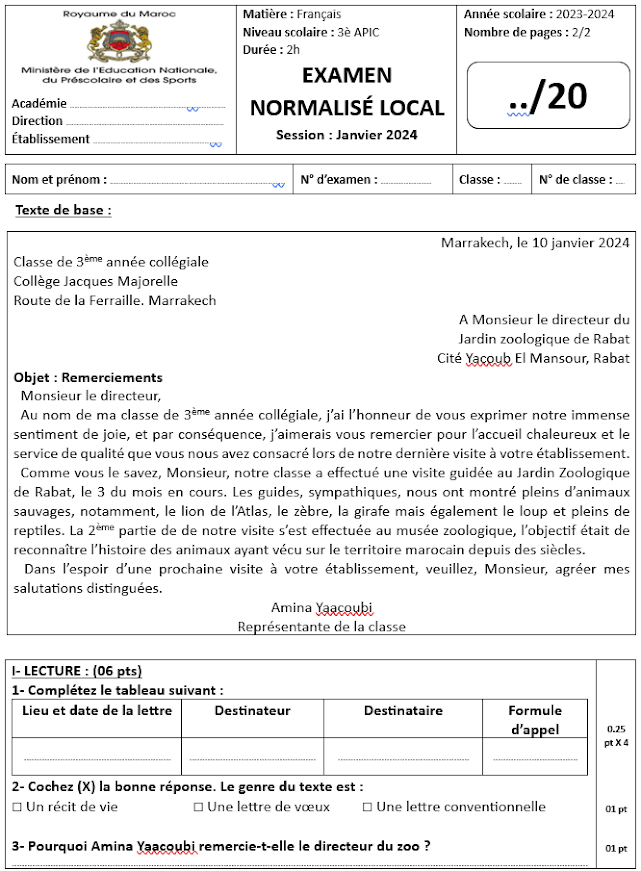 Le sujet entier : Un contrôle normal de 2 heures pour voir comment tu te débrouilles en français, comme en 3ème année collège (3ème APIC) au Maroc.